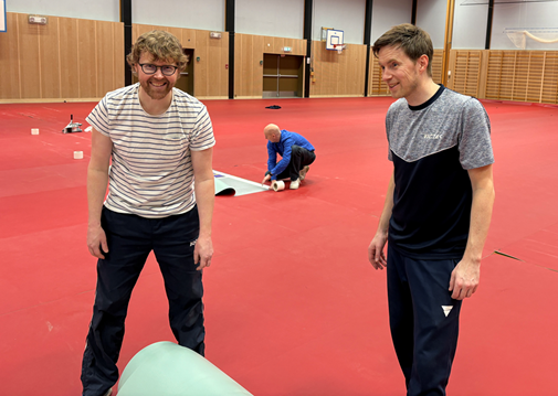 Selv om Eirik er tidligere Tysklands-proff og heltidsansatt trener, var det aldri et problem å ta på seg dugnadsjobbing. Her legger han gulv foran NM sist sesong sammen med en annen tidligere Bundesliga-proff, Geir Erlandsen