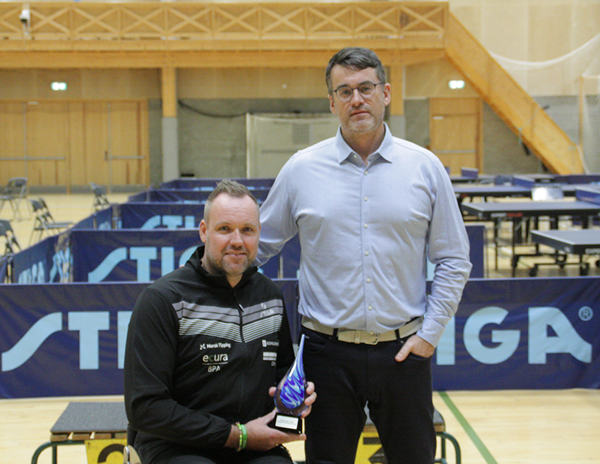 Tommy Urhaug har her mottatt da synliga beviset på at han er æresmedlem i Norges Bordtennisforbund frå President Christian Ibenfeldt.